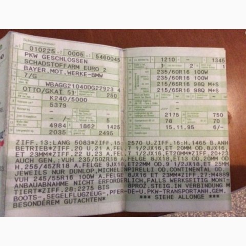 Abmeldung erfolgte im Juni 2015, letzter TÜV-Bericht vom 04.07.2013 bei 200.100 km ohne festgestellte Mängel, Radio BMW-Card vorhanden, Fahrzeugschlüssel 2, 8-fach bereift, original BMW-Alufelgen mit Winterreifen DOT 5109, ca. 6 mm Profil, Alufelgen mit Sommerbereifung DOT 2011, ca. 6 mm Profil, scheckheftgepflegt, letzter Eintrag am 23.04.2014 bei 202729 km, gepfelgtes Fahrzeug mit dem Alter und der Laufleistung entsprechende Gebrauchsspuren wie ein paar Lackkratzer und beginnender Rost an Türkanten, Heckblech, Radlauf, Motor Getriebe, Bremsen und Lenkung ohne Auffälligkeiten, Knackgeräusch im Fahrwerk, Klima funktioniert.