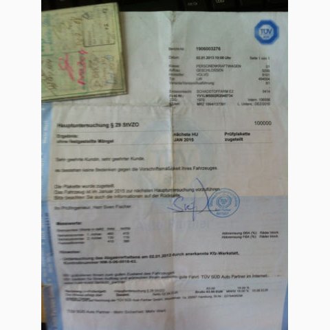 Scheckheft zum ahrzeug liegt vor, letzter Eintrag jedoch am 19.12.2000 bei 62232 km, letzte TÜV-Untersuchung am 02.01.2013 bei km 106556 ohne Mängel